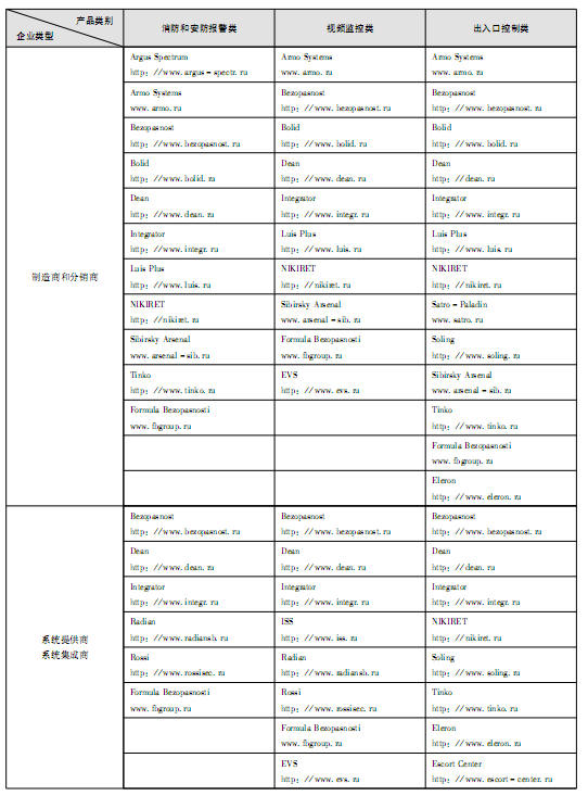 為了便于我們國內(nèi)有意向進入俄羅斯市場的企業(yè)準確尋求到俄當(dāng)?shù)乇容^有實力的合作商,現(xiàn)將這300多家安防企業(yè)內(nèi)具備較強實力的公司列出,供我們國內(nèi)企業(yè)參考,詳情見下表: